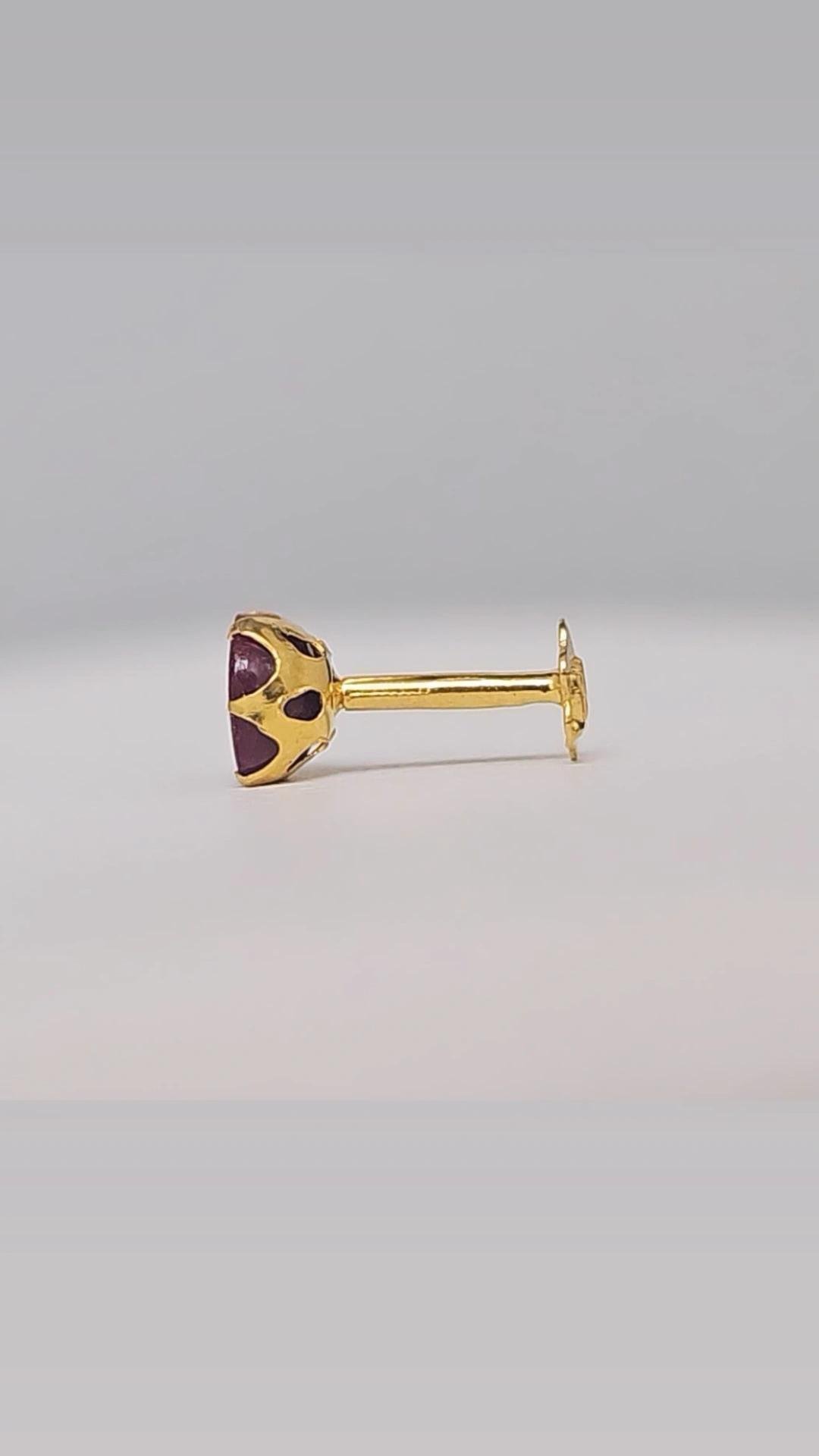 This Classic Ruby Gold Nose Stud is crafted in 9K yellow gold and set with a rich round ruby stone, offering a refined yet durable design ideal for daily wear. The prong setting securely holds the stone while enhancing its natural colour and shine.