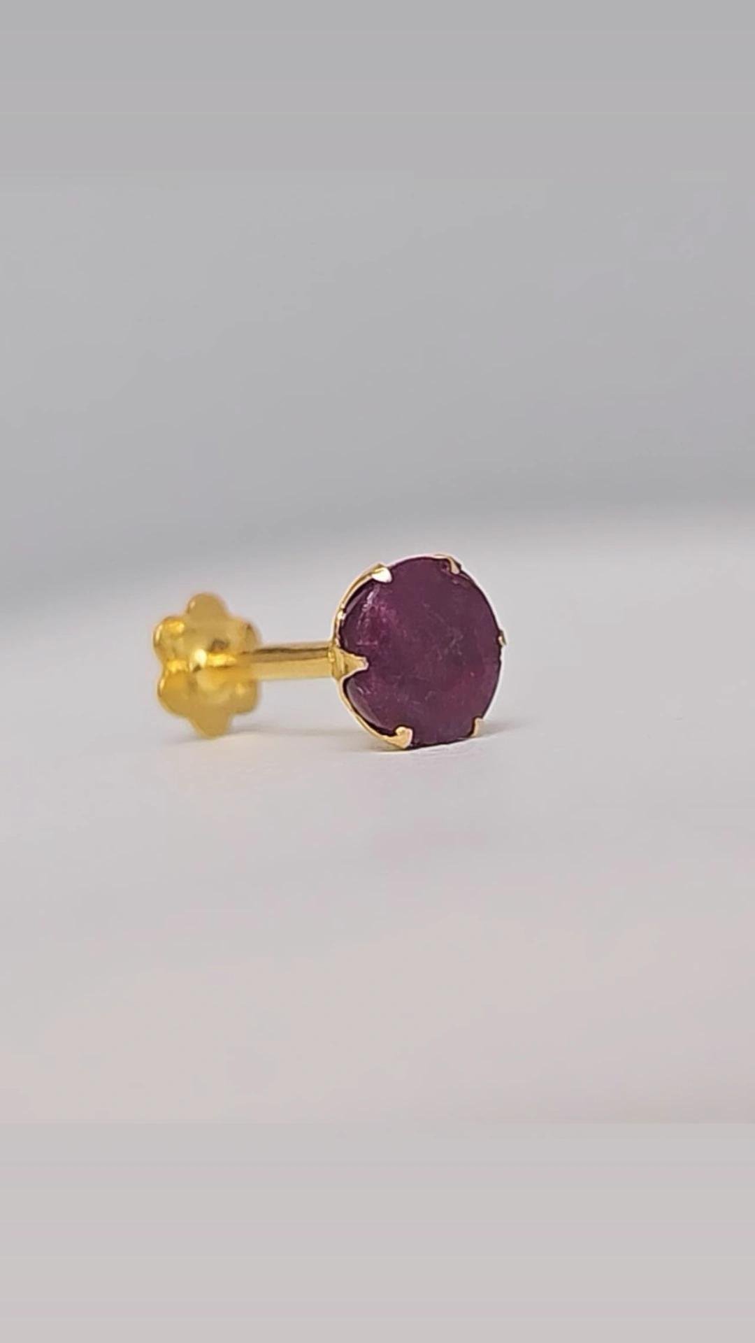 Elegant ruby nose stud crafted in 9 carat gold, featuring a deep red round ruby stone in a secure setting. Lightweight, comfortable, and perfect for everyday wear.